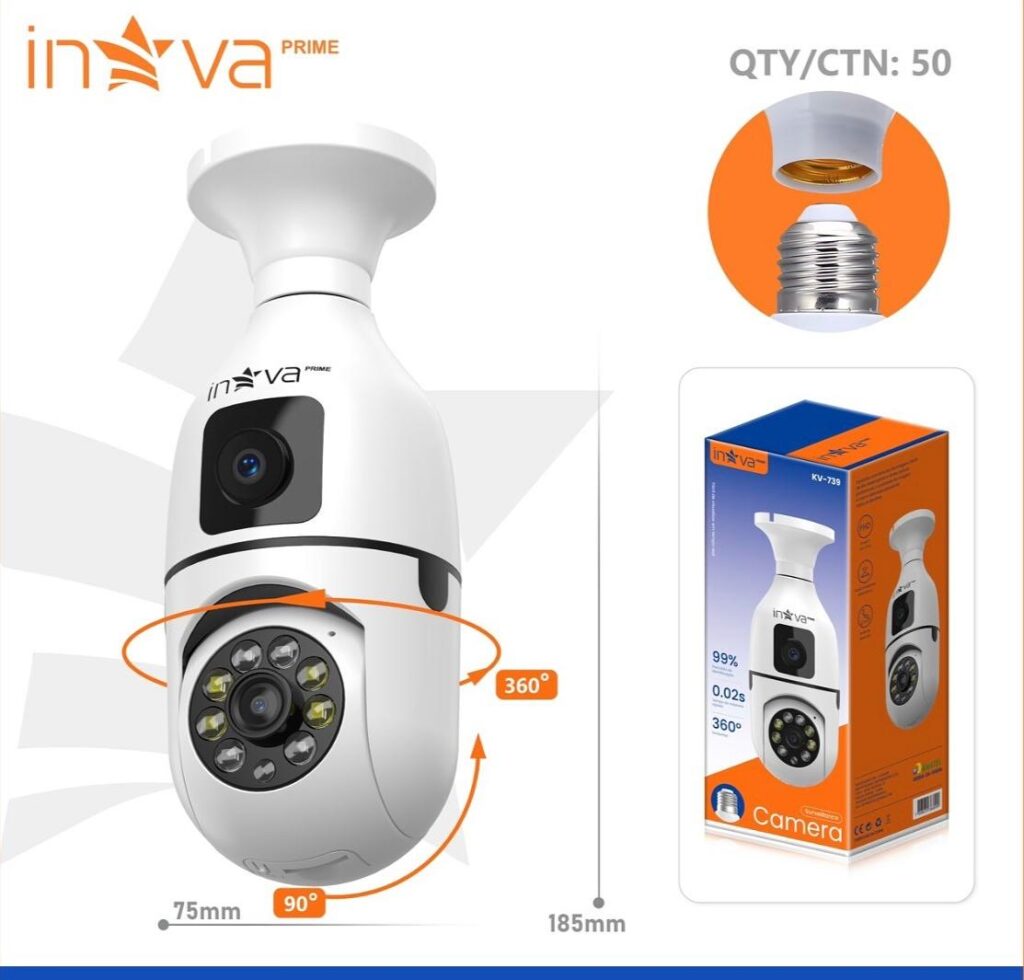 A Câmera Lampada Inova KV 739 Lente Dupla WiFi HD Inova PTZ IP44 ICSEE é a solução ideal para quem busca segurança e praticidade em um único produto. Com um design inovador que se adapta ao soquete E27, ela se integra facilmente em qualquer ambiente, seja na garagem, quarto ou sala.